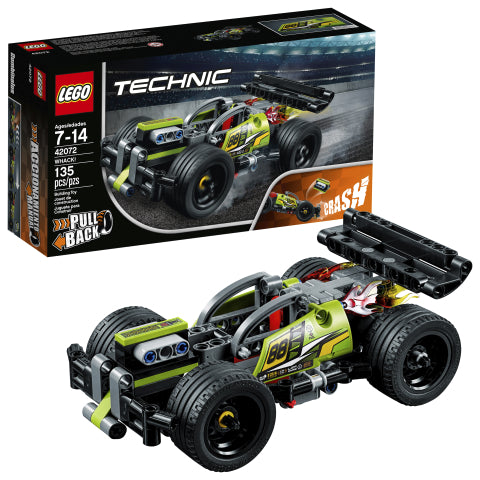 Experience the amazing power and acceleration of this high-speed LEGO® Technic 42072 WHACK! model, featuring a lime-green, red and gray color scheme with racing stickers, sturdy front bumper, large rear spoiler and wide black rims with low profile tires. This advanced building set is equipped with a pull-back motor and a new-for-December-2017 engine pop-out function, which is activated on impact. Combine with the 42073 BASH! pull-back model for extended play possibilities or to create the WHACK! ‘N’ BASH! combi model.
