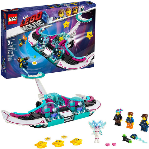 Kids will have a wild time role-playing as popular characters from THE LEGO® MOVIE 2™ and staging space battles with the 70849 Wyld-Mayhem Star Fighter! (LEGO and the LEGO logo are trademarks of the LEGO group, here used by special permission). This LEGO spaceship toy features 2 cockpits (for Wyldstyle and Sweet Mayhem), star-disc shooter, and a bomb-dropping function to release 3 Star figures from the rear compartment. This THE LEGO MOVIE 2 set also includes 3 minifigures and a mini-doll figure, plus weapons and accessories.